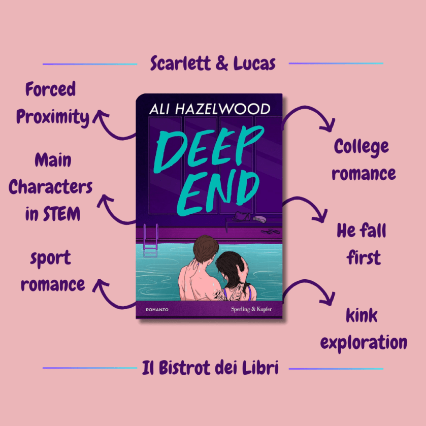 Ali Hazelwood è, indiscutibilmente, una delle nostre romanziere preferite. In casa de ‘Il bistrot dei libri’ quando sta per uscire un romanzo di questa autrice si preparano festeggiamenti secondi solo a quelli del mese del Salone del Libro. Fatta questa doverosa premessa veniamo a ‘Deep End‘, uscito a inizio mese per la Sperling & Kupfer: fondamentalmente è uno sport romance ambientato al college di Stanford dove una promettente tuffatrice in crisi e un nuotatore olimpionico cercano segretamente del sesso kink e rischiano, clamorosamente, di innamorarsi perdutamente.